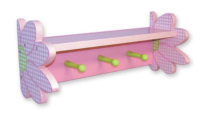 - DARLING DAISY- SHELF W/PEGS; 18" x 8" x 6.5".Darling Daisy shelf with three pegs; some assembly required. 18"L x 8"H x 7"W.